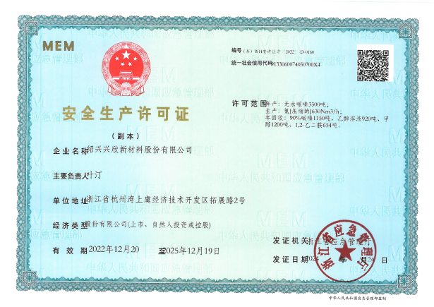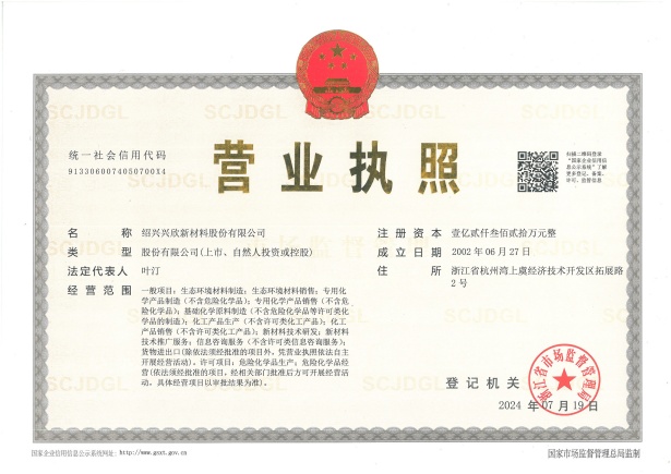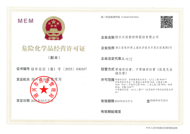 紹興興欣新材料股份有限公司成立于2002年06月27日,占地面積122畝,位于杭州灣上虞經(jīng)濟(jì)技術(shù)開(kāi)發(fā)區(qū)拓展路2號(hào),現(xiàn)有職工200余人,專業(yè)技術(shù)人員50余人;博士、碩士研究生30余人組成的一支知識(shí)型、專業(yè)化的技術(shù)科研團(tuán)隊(duì)。公司面向全球市場(chǎng),專業(yè)開(kāi)發(fā)電子化學(xué)品、環(huán)保化學(xué)品、醫(yī)藥中間體、高分子材料等先進(jìn)新材料重點(diǎn)領(lǐng)域的省級(jí)科技型企業(yè);建有浙江上虞、安徽東至兩個(gè)生產(chǎn)基地。目前為“國(guó)家高新技術(shù)企業(yè)”、浙江省“隱形冠軍”企業(yè)、浙江省專精特新中小企業(yè);建有“省級(jí)”研究開(kāi)發(fā)中心,共建天津大學(xué)浙江紹興研究院電子化學(xué)品研發(fā)中心。